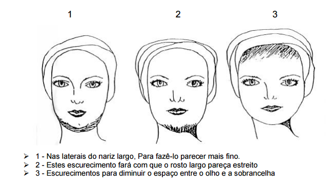 Aplique a base, o pó ou a sombra (opaca), num tom mais escuro que a pele, nas laterais do nariz e das sobrancelhas até as narinas, no caso de uma cor mais clara, Aplique dos olhos até antes da ponta do nariz, esfume bem para que o limite das cores não apareça.