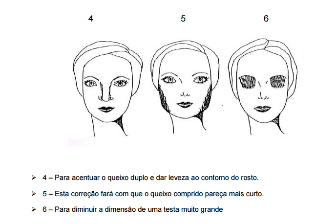A testa do maxilar é estreita e as “maçãs” do rosto são salientes. O ideal é alargar o maxilar inferior e estreitar o maxilar superior. Aplique uma base dois tons mais claras nas laterais da testa; aplique a mesma base nos ângulos do maxilar inferior e outra de dois tons mais escura nos ângulos do maxilar superior, aplique o blush um dedo além da linha do sorriso, no meio das faces, até um pouco abaixo do meio da orelha.