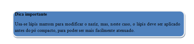 Para alarga o nariz aplique a base, pó ou sombra (opaca), num tom mais claro qe a pele, nas laterais do nariz e esfume. Aplique também um tom mais escuro na ponta do nariz, esfume bem para que o limite das cores não apareça.