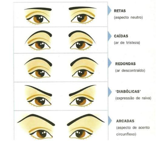 Para que a expressão facial apresente equilíbrio, o traçado da sobrancelha deve respeitar o tipo e a estrutura do rosto. Os formatos mais comuns são os seguintes: