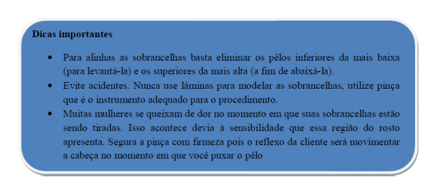 Depilação: para as sobrancelhas, somente pinça. Nunca usar gilete, que estimula o crescimento dos pelos e os engrossa.