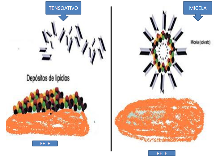 • Para isso, é necessário utilizar substâncias anfifílicas – que tenham ao mesmo tempo afinidade (solubilidade) por substancias oleosas (sebo) e também pela água, formando uma emulsão. O sebo emulsionado facilita sua remoção da pele.