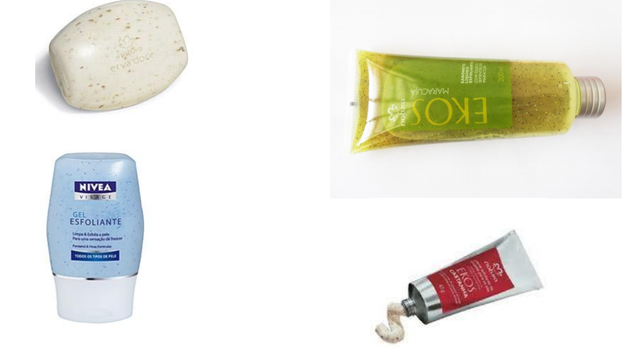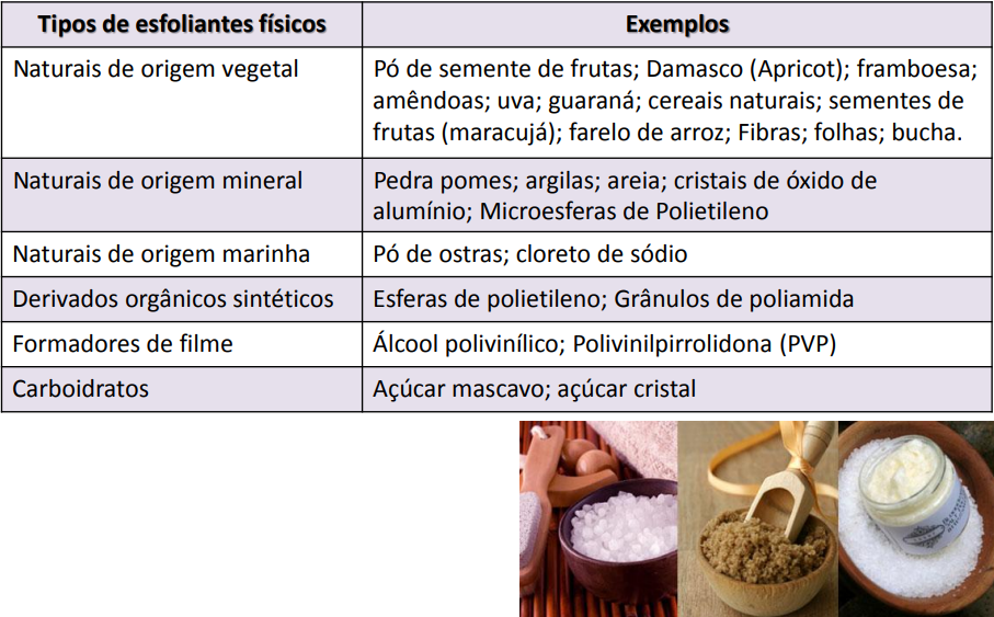 • Esfoliação física ou mecânica – o ativo não interage com a pele, por ação mecânica provocada pela pressão do ativo contra a pele e as mãos que estão aplicando o produto, descama os corneócitos, que já estão em processo de desprendimento.