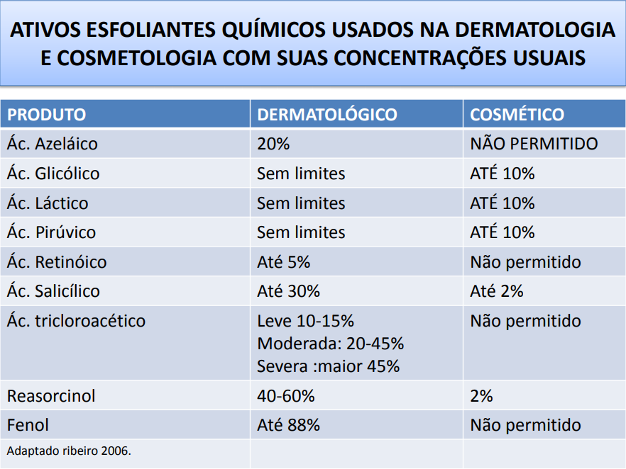 • Esfoliação química – Consiste na aplicação de um ou mais agentes químicos esfoliantes na pele, resultando: