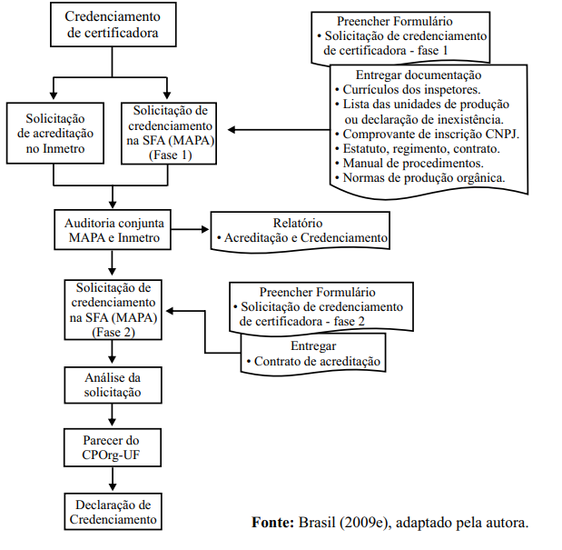 No Brasil, o credenciamento das certificadoras está normalizado no art. 7 § 1° e 2° da IN nº 19 (BRASIL, 2009c) e compreende duas fases. Na fase 1, a certificadora faz a solicitação para auditoria conjunta com o INMETRO, conforme o art. 23 da IN nº 19/09 e formulário próprio. Na fase 2, a certificadora apresenta o documento de acreditação e novo formulário de solicitação de credenciamento ao SEPDAG/SAF da unidade da federação em que estiver sediado, que os enviará à COAGRE/MAPA. Após ouvir as CPOrgs-UF, a COAGRE emitirá a Declaração de Credenciamento do OAC e a autorização para usar o selo do SISORG.