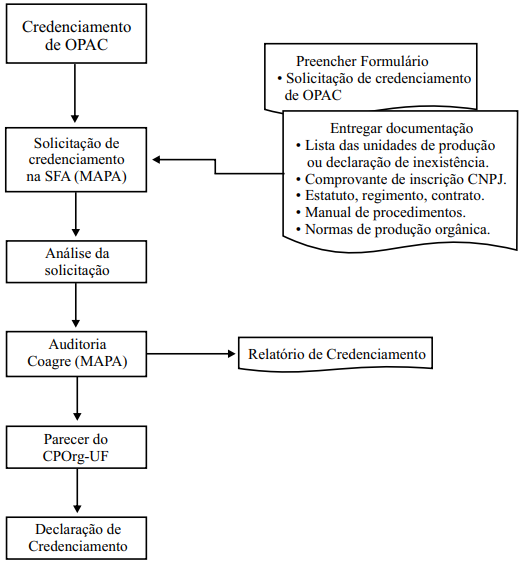 Os OACs deverão ser credenciados pelo MAPA. No caso das certificadoras, o credenciamento será precedido pela acreditação segundo a norma ISO65, do Instituto Nacional de Metrologia, Normalização e Qualidade Industrial (INMETRO). O credenciamento dos Organismos Participativos de Avaliação da Conformidade (OPAC) responsáveis por um SPG será precedido por auditoria realizada pela Coordenação de Agroecologia - COAGRE/MAPA.