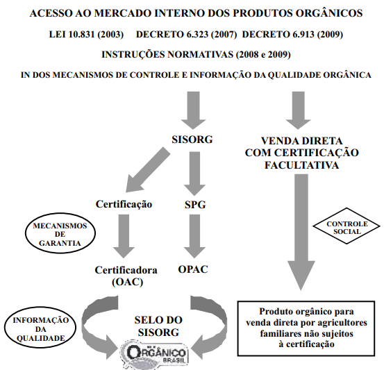 As possibilidades de acesso dos produtos da agricultura orgânica ao mercado brasileiro estão previstas na Lei nº 10.831 (BRASIL. Presidência da República, 2003), nos Decretos nº 6.323 (BRASIL. Presidência da República, 2007) e nº 6.913 (BRASIL. Presidência da República, 2009b) e nas Instruções Normativas nº 54 e nº 64 (BRASIL, 2008a, 2008b), nº 17, nº 18 e nº 19 (BRASIL, 2009a, 2009b, 2009c).