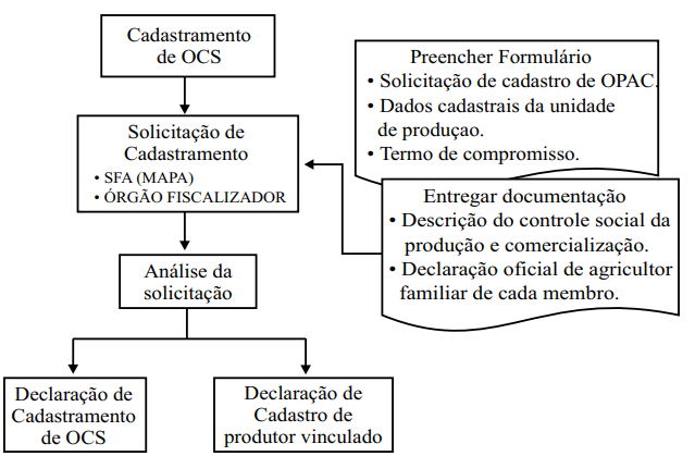 Os órgãos fiscalizadores responsáveis pelo cadastramento e acompanhamento das OCS são as Superintendências Federais de Agricultura - SFAs nas Unidades da Federação ou mediante convênio com outros órgãos da esfera federal, estadual ou distrital. O prazo para adequação aos regulamentos estabelecidos, ou seja, o cadastramento das OCS que já atuam na rede de produção orgânica, termina no dia 28 de dezembro de 2009. A seguir é demonstrado o passo a passo do cadastramento das OCS.