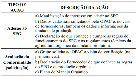 O grupo deve então solicitar ao OPAC, por escrito, que seja feita a avaliação participativa das unidades de produção dos membros, especificando o escopo pertinente.Depois da adesão ao SPG, a avaliação da conformidade se dará em três etapas:
