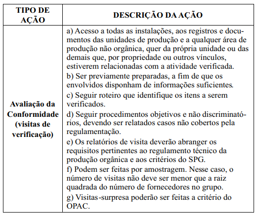 - visita de inspeção anual obrigatória para controle interno (realizada pelos técnicos da entidade) em 100% das unidades dos grupos de produtores (associação, cooperativa, condomínio) inscritos no projeto. Cada unidade produtora deve fornecer uma série de informações (cadastro, termo de compromisso, histórico de cada lavoura, normas de registro das intervenções nos cultivos/criações, lista com os problemas - não conformidades, descrição de estoques e medidas de separação dos mesmos);