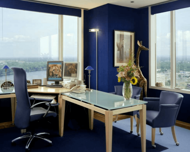 Cor do céu e do mar, da simpatia, harmonia e fidelidade. Simboliza confiança, responsabilidade, sabedoria, inteligência, fé. Entre as características que nos afetam fisiologicamente, o azul tem efeito calmante, suprime o apetite. Ideal para ambientes de trabalho e salas de reunião, já que ajuda a comunicação e a fala.