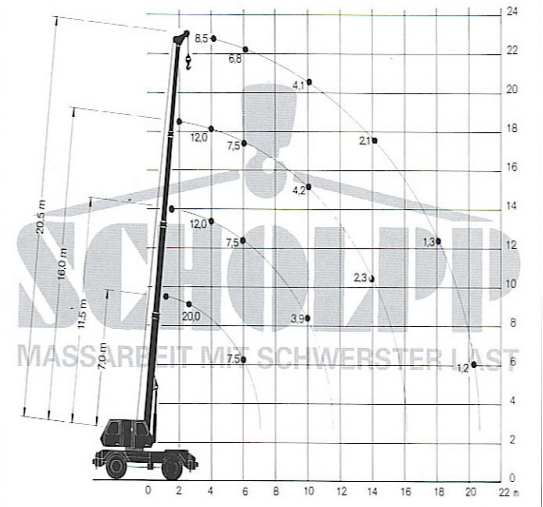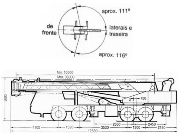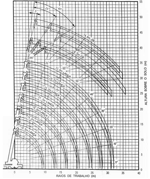 Acompanha ainda a tabela de cargas um gráfico, Altura sobre o Solo x Raios de Trabalho, que finaliza a composição da mesma.