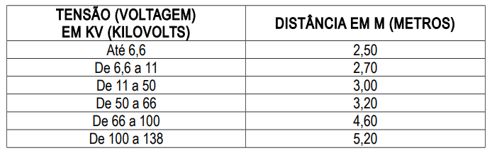 22. Deve ser verificado se a lança, mastro, contra-peso, cabos ou qualquer componente do equipamento de movimentação de carga está posicionado em relação aos cabos de alta tensão, de acordo com o estabelecido na tabela abaixo: