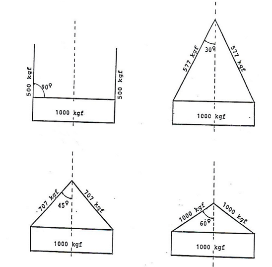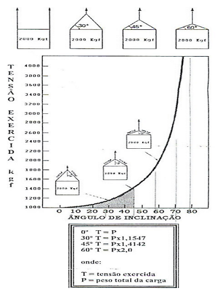 23. Deve ser verificada a tensão no laço quando aplicada com alguma inclinação, podendo gerar algum acidente, pois em alguns casos a diferença entre tensões é bastante grande. O quadro abaixo mostra o fenômeno físico que ocorre com a tensão aplicada nas pernas dos laços quando expostas à inclinação: