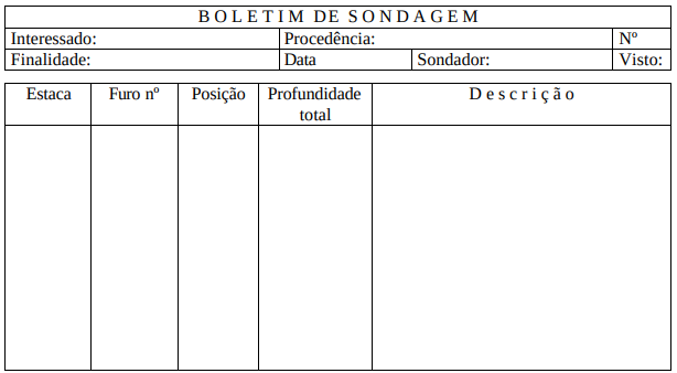 As anotações referentes a Bloco de Rocha, Matacão e Pedra de Mão, complementarão a descrição das camadas, quando for o caso. Para a identificação dos solos pela inspeção expedita, são usados testes expeditos, como: teste visual, do tato, do corte, da dilatância, da resistência seca, etc. A cor do solo é elemento importante na classificação de campo. As designações "siltoso" e "argiloso" são dadas em função do I.P., menor ou maior que 10, do material passando na peneira de 0,42 mm (nº 40). O solo tomará o nome da fração dominante, para os casos em que a fração passando na peneira nº 200 for menor ou igual a 35%; quando esta fração for maior que 35%, os solos são considerados siltes ou argilas, conforme seu I.P. seja menor ou maior que 10. Todos os elementos referidos, obtidos durante a inspeção expedita, são anotados no "Boletim de Sondagem" (Figura 1)