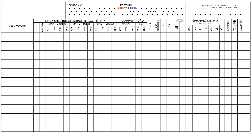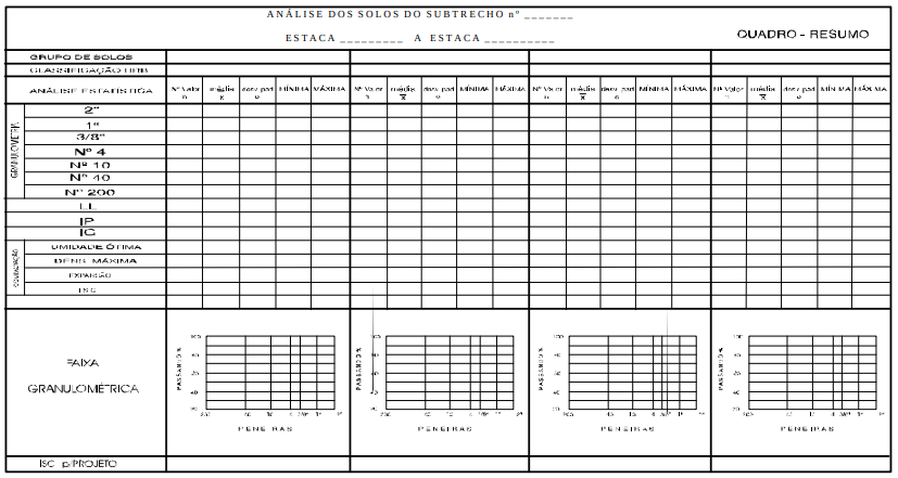 Segundo o DNER (1996) os resultados dos ensaios de laboratórios devem constar de um "Quadro - Resumo de Resultados de Ensaios" (Figura 2), notando-se que, para dar generalidade ao modelo, figuram ensaios que podem não ser feitos durante o reconhecimento do subleito. Com base no "Quadro-Resumo", é feita separadamente, para cada grupo de solos da classificação TRB, uma análise estatística dos seguintes valores: