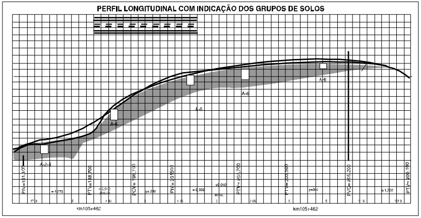 Outros critérios de análise estatística para a determinação de valores máximos e mínimos prováveis poderão ser utilizados desde que devidamente justificados. A análise estatística dos diversos grupos de solos encontrados no subleito pode ser apresentada, conforme o Quadro da Figura 3. Um perfil longitudinal com indicação dos grupos de solos pode ser visto na figura 4.