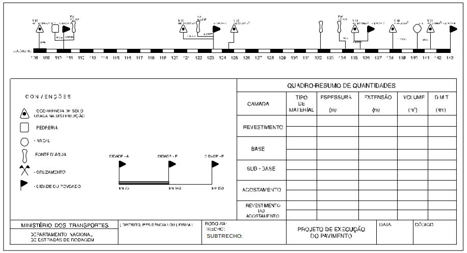 - Traçado do perfil longitudinal: De posse dos resultados dos ensaios feitos em cada camada ou horizonte de cada furo, traça-se o perfil longitudinal de solos constituintes do subleito estudado.