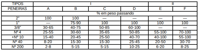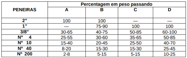 - Percentagem, em peso, passando nas peneiras utilizadas no ensaio de granulometria. Geralmente são analisadas as percentagens, passando nas peneiras nº 10, nº 40 e nº 200.