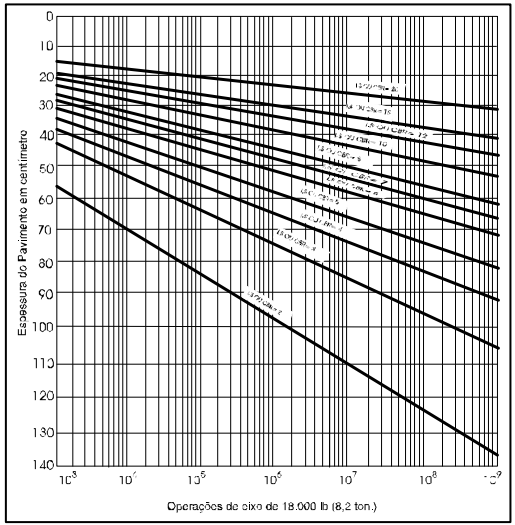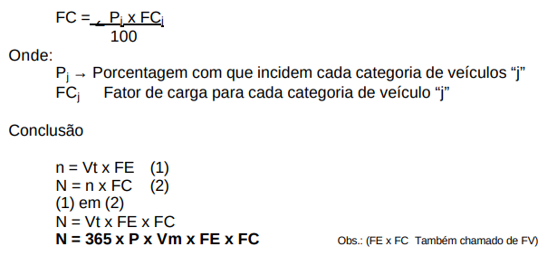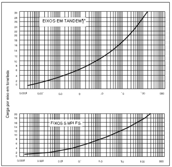Representa o número de repetições de carga equivalente a um eixo de 8,2 ton tomado como padrão (Eixo Padrão Rodoviário). Este é o parâmetro de maior importância na maioria dos métodos e processos de dimensionamento de pavimentos. É definido da seguinte maneira: N = n x FC Sendo FC (Fator de carga) o número que multiplicado pelo número de eixos dá o número equivalente de eixos padrão. É conseguido através de gráficos específicos e é função da valor da carga de eixo (simples, tandem duplo, tandem triplo). A Figura 12, dá os fatores de equivalência de operação entre eixos simples e "tandem", com diferentes cargas e o eixo simples padrão com carga de 8,2t (18.000 lbs). O valor a ser adotado em projeto é dado pela seguinte expressão: