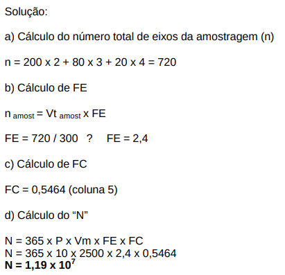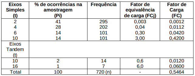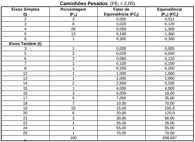 Considerando um período de projeto de 10 anos, Vm = 3000 veículos, e tomando como base os dados de pesagem apresentados no quadro abaixo, pede-se: