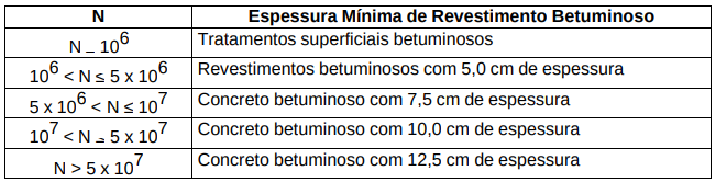 (Tabela de espessura mínima de revestimento betuminoso que depende do número N)
