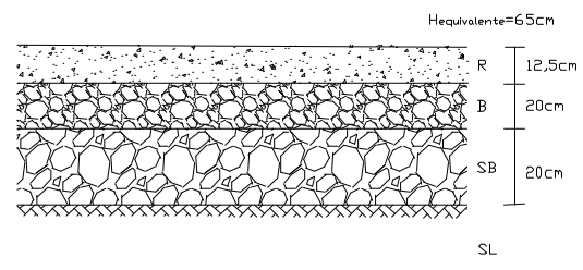 Mesmo que o C.B.R. ou I.S. da sub-base seja superior a 20, a espessura do pavimento necessário para protegê-la é determinada como se esse valor fosse 20 e, por esta razão, usam-se sempre os símbolos, H20 e h20 para designar as espessuras de pavimento sobre sub-base e a espessura de sub-base, respectivamente. Os símbolos B e R designam, respectivamente, as espessuras de base e de revestimento. Uma vez determinadas as espessuras Hm , Hn , H20, pelo gráfico da Figura 43, e R pela tabela apresentada, as espessuras de base (B), sub-base (h20) e reforço do subleito (hn ), são obtidas pela resolução sucessiva das seguintes inequações:
