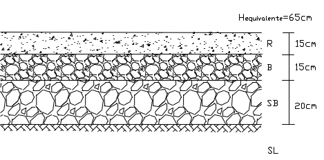 No caso de ocorrência de materiais com C.B.R. ou I.S. inferior a 2, é sempre preferível a fazer a substituição, na espessura de, pelo menos, 1 m, por material com C.B.R. ou I.S. superior a 2. A espessura mínima a adotar para compactação de camadas granulares é de 10 cm, a espessura total mínima para estas camadas, quando utilizadas, é de 15 cm e a espessura máxima para compactação é de 20 cm. A Figura 14 apresenta simbologia utilizada no dimensionamento do pavimento, Hm designa, de modo geral, a espessura total de pavimento necessário para proteger um material com C.B.R. ou I.S. = CBR ou IS = m, etc., hn designa, de modo geral, a espessura de camada do pavimento com C.B.R. ou I.S. = n, etc.