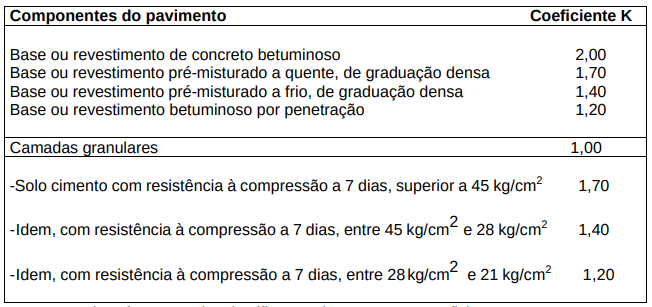 São os seguintes os coeficientes de equivalência estrutural para os diferentes materiais constitutivos do pavimento: