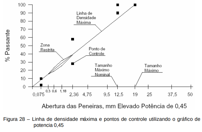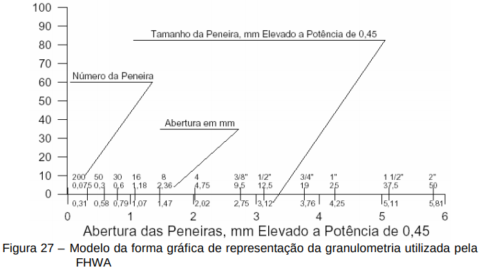 O tamanho nominal máximo é definido como o maior tamanho de peneira, acima do qual nenhum material é retido. A FHWA recomenda que este gráfico seja usado como parte do processo de dosagem de misturas asfálticas. Exemplos desta forma de apresentação da granulometria pode ser vista nas figuras 27 e 28.