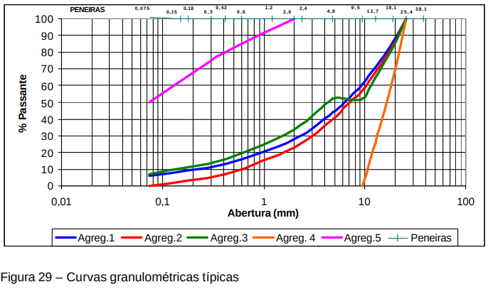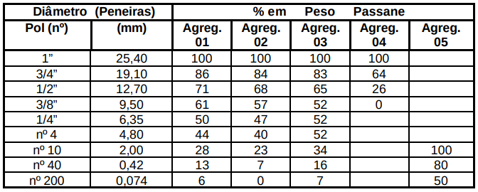 O cimento Portland é considerado um filer, do ponto de vista granulométrico, bastante usado nas misturas betuminosas, mas em concreto de cimento é considerado como elemento aglutinante (ligante). Os resultados de análises granulométricas de um agregado pode ser apresentado sob a forma tabular (Quadro 1) ou de curva granulométrica (Figura 2), geralmente sob a forma de percentagem total passante em cada peneira. Para o DNER: