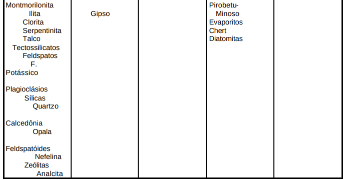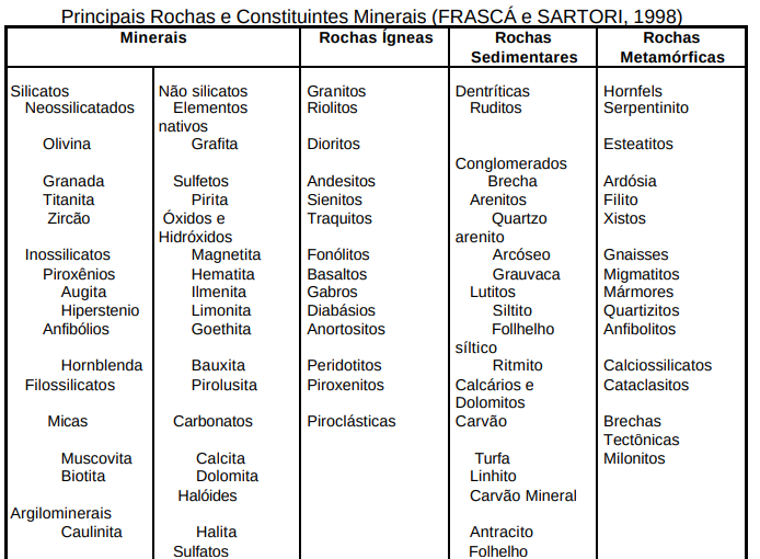 Segundo FRASCÁ e SARTORI (1998) durante o processo de diferenciação geoquímica da terra, que resultou na formação da sua parte sólida mais externa (crosta terrestre), dez elementos ali se concentraram, totalizando cerca de 99% da sua composição. O oxigênio (46,6%) e o silício (28,2%) são os elementos mais comuns nos minerais formadores de rochas, chamados de silicatos. Os demais são: Al (8,2%), Fe (5,6%), Ca (4,2%) e outros (Na, K, Mg, Ti e P). Embora já tenham sido descritas e classificadas mais de 2000 espécies minerais, apenas um pequeno número é formador das rochas.