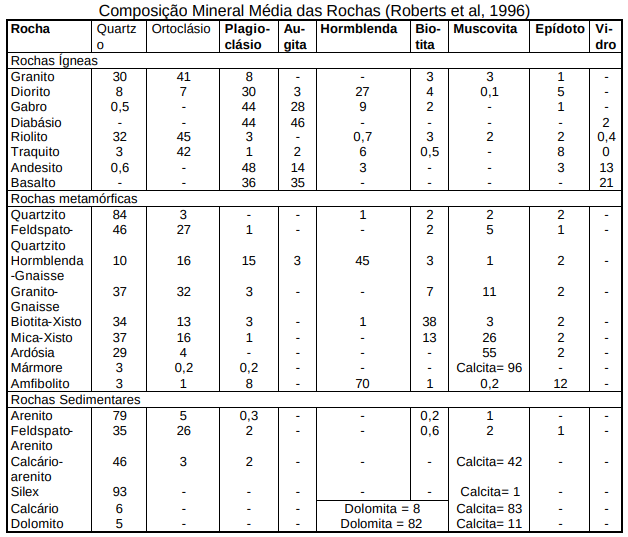 São derivadas de outras preexistentes que, no decorrer dos processos geológicos, sofreram mudanças mineralógicas, químicas e estruturais, no estado sólido, em resposta a alterações das condições físicas (temperatura, pressão) e químicas, impostas em profundidades abaixo das zonas superficiais de alteração e cimentação, ou seja, no domínio das transformações diagenéticas (FRASCÁ e SARTORI, 1998). Desta forma, a Tabela a seguir sintetiza os minerais e as rochas associados e descritos por FRASCÁ e SARTORI (1998). A próxima tabela mostra a composição mineral média comumente encontrada nos agregados das principais rochas, segundo ROBERTS et al (1996).