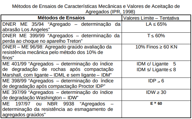 A tabela a seguir apresenta para estes métodos de ensaios para agregados mais recentemente padronizados no Brasil os valores limites que foram estabelecidos em recente pesquisa do DNER (IPR, 1998).