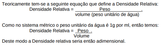Segundo PINTO (2000) as relações entre quantidade de matéria (massa) e volume são denominadas massas específicas, e expressas geralmente em ton/m3 , kg/dm3 ou g/cm3 e as relações entre pesos e volumes são denominados pesos específicos e expressos geralmente em KN / m3 . A expressão “densidade”, comum na engenharia, se refere à massa específica e “densidade relativa” é a relação entre a densidade do material e a densidade da água a 4°C. Como esta é igual a 1 kg/dm3 , resulta que a densidade relativa tem o mesmo valor que a massa específica (expressa em g/cm3 , kg/dm3 ou t/m3 ), mas é adimensional.