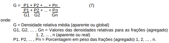 Quando se trabalha com mistura de 2 ou mais frações (ou 2 ou mais agregados) pode-se computar um valor para a densidade relativa média através de um valor médio ponderado das várias frações (agregados) que constituem a mistura, pela seguinte equação: