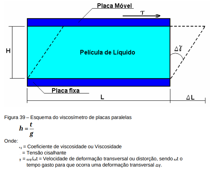 No viscosímetro de placas paralelas pode-se observar a lei de Newton para os fluidos: “A resistência ao deslocamento relativo das partes de um líquido é proporcional à velocidade com que estas partes se separam uma da outra.” A viscosidade é uma medida da consistência que o material apresenta ao movimento relativo de suas partes ou ainda de sua capacidade de fluir. É a característica inerente ao material de opor-se ao fluxo ou deslocamento de uma partícula sobre partículas adjacentes devido a uma espécie de atrito interno do material.
