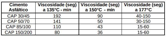 A viscosidade saybolt exprime o tempo , em segundos, que uma determinada quantidade de material leva para se escoar em determinada temperatura e em condições padronizadas. São comumente utilizadas as temperaturas de 25, 50, 60 e 82,2° C para asfaltos diluídos e emulsões e para cimentos asfálticos a viscosidade é medida a 135° C. As especificações para o cimento asfático do petróleo fixam os seguintes valores mínimos: