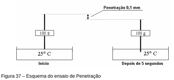 Este ensaio mede a consistência do CAP pela penetração de uma agulha de dimensões padronizadas, em décimos de milímetros, submetida a uma carga préestabelecida de 100 g durante 5 segundos a uma temperatura de 25° C. Este ensaio dá uma idéia da consistência para fins de classificação. Existem outras condições para a realização do ensaio, sendo função das propriedades dos asfaltos, como por exemplo: 0° C, 200g e 60 seg. ou 46,1° C, 50g e 5 seg. Esquema do ensaio: