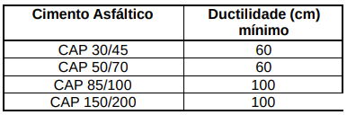 Ductilidade é a propriedade de um material suportar grandes deformações (alongamento) sem ruptura. Tem por finalidade, este ensaio, medir a resistência à flexibilidade. A medida da ductilidade é dada pela distância (em cm) que um corpo de prova de material betuminoso, em condições padronizadas, submetido a um esforço de tração, também em condições especificadas, se rompe. A maioria dos cimentos asfálticos para pavimentação tem ductilidade superior a 100. As especificações para o CAP fixam os seguintes valores: