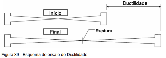A medida da ductilidade é tomada coma a distância máxima que o corpo de prova conseguir se estender até o momento da ruptura. Deve-se tomar a média de três determinações para o valor da ductilidade final.