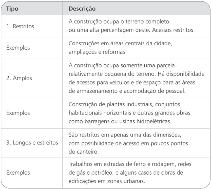 De acordo com Illingworth (1993), os canteiros de obra podem ser enquadrados dentro de um dos três seguintes tipos: restritos, amplos e longos e estreitos. No Quadro 2.1 é caracterizado cada um destes tipos.