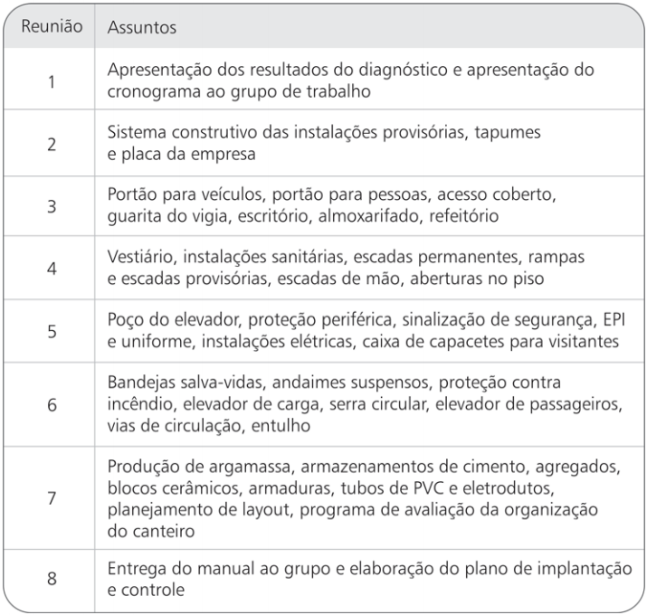 No fechamento da etapa deve ser feita uma reunião, contando com a presença de mestres, engenheiros de obra e diretores, sendo apresentadas e discutidas as conclusões do diagnóstico, além de sugeridas soluções para os problemas encontrados. Nesta reunião também devem ser definidos os participantes do grupo de padronização e quais instalações serão padronizadas. Este grupo não deve ter um número excessivo de participantes (seis pessoas é um bom limite máximo), devendo envolver engenheiros, mestres-de-obras e técnicos em segurança. É fundamental que um ou mais dos componentes do grupo detenha poder de decisão dentro da empresa, de forma que, com base nos recursos e necessidades da empresa, seja dada agilidade às decisões, facilitando o processo de implantação do padrão estabelecido.
