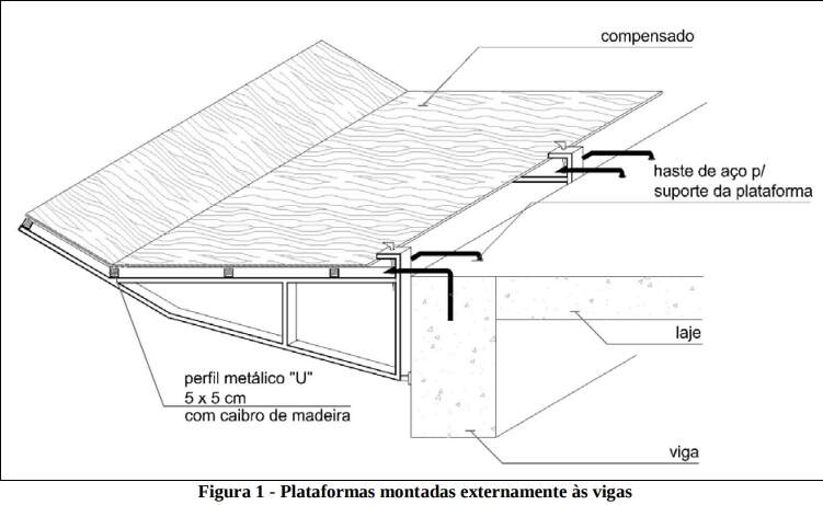 é a primeira a ser instalada e a última a ser desmobilizada, passando por várias etapas de execução do empreendimento. Devem ser elaboradas plantas baixas especificando em quais pavimentos serão instaladas as plataformas, seguindo recomendações da NR-18. Quanto ao sistema adotado, pode-se utilizar vigas de madeira ou suportes metálicos, avaliando-se o custo benefício da aquisição de peças metálicas que podem ser reaproveitadas em outras edificações da empresa. Definindo-se o sistema, fica determinada a dimensão e a posição (altura e cotas) das hastes que podem ser instaladas. A planta deve apresentar o espaçamento entre esperas, sua distância até a borda da laje ou viga, dimensões da espera para encaixe adequado do suporte evitando improvisações, detalhamento do formato e especificação da bitola de aço das esperas a serem confeccionadas. Estas especificações devem estar detalhadas no projeto estrutural com a finalidade de evitar consultas ou falhas devido à existência de mais um documento.