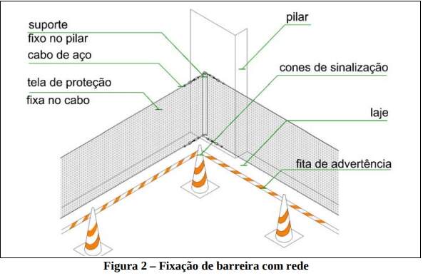 Deve-se apresentar planta baixa do pavimento com o posicionamento das proteções coletivas a serem implantadas, bem como dos equipamentos de transporte vertical e sua forma de acesso ao pavimento, seja na forma de cancelas para elevadores de passageiros e de materiais, seja na forma de plataformas de acesso para gruas. O GcR instalado na fase de estrutura deve ser mantido até que a vedação externa do pavimento atinja a altura de 1,20m. Portanto, é importante que o sistema de proteção adotado na fase de estrutura permaneça pelo maior tempo possível. No caso de proteções de sacada, o sistema GcR metálico sugerido no item acima, não interfere nos serviços de impermeabilização de piso e vigas, podendo ser mantido nesta atividade. Para sistemas não tradicionais ou mistos, com emprego de structural glassing e/ou painéis cimentíceos deve-se detalhar outros tipos de medidas de proteção, pois tanto o GcR quanto as plataformas de limitação de quedas de materiais não se adequam aos procedimentos de produção da edificação. Nestes casos deve-se empregar sistema de barreira com rede, telas de advertência e restrições de acesso a pavimentos em acordo com o MTE (Figura 2).