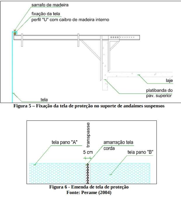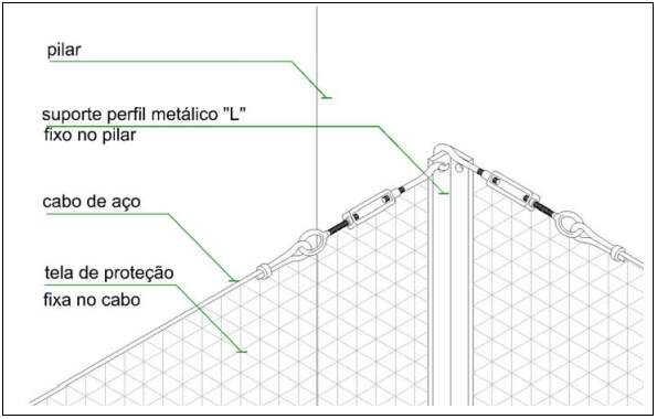 Estes sistemas são de fácil instalação, havendo a necessidade de detalhamento com relação a tipo, local a serem empregados, quantidade de esticadores, tela, suportes para fixação na estrutura da edificação (Figura 3), forma de fixação do suporte na estrutura, cabos de aço superior e inferior, verificando se dimensões e resistência estão de acordo com as especificadas em normas.