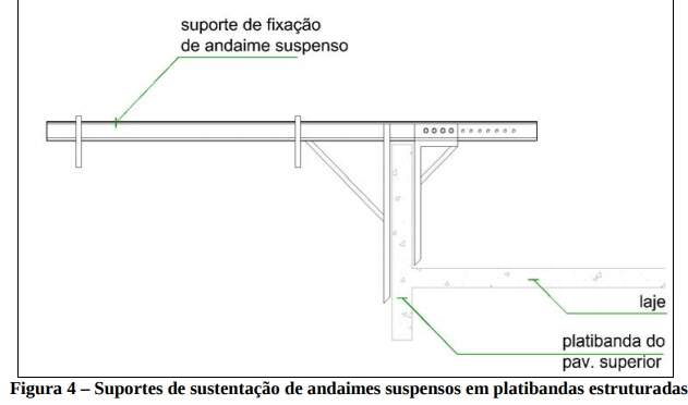 Para execução dos serviços de revestimento e acabamentos externos deve-se especificar, através de cálculos, o tipo de estrutura e de sistemas de fixação de andaimes externos, principalmente os suspensos. Deve-se detalhar a quantidade e o sistema de fixação das catracas duplas a serem empregadas; o sistema de fixação do andaime, do cabo-guia e do trava quedas na estrutura da edificação; o sistema de fixação do GcR nos três lados do andaime e o local de fixação do andaime Quanto ao sistema de fixação do andaime, no projeto estrutural, pode-se dimensionar platibandas nas lajes de cobertura calculadas para receber as cargas dos andaimes, facilitando a instalação de suportes metálicos encaixados à estrutura da edificação (Figura 4), evitando esperas ou quebras em lajes para passagem de cabos de aço que impedem a execução de serviços em telhados. Os projetistas devem ficar atentos quanto à inclinação do telhado, verificando a altura final do mesmo e se há altura suficiente para implantação desses suportes sem interferir na execução do telhado. Pode-se avaliar na fase de concepção dos projetos se existe a possibilidade de inversão da inclinação dos telhados ou criar mais algumas águas para que a platibanda não fique muito alta, interferindo na arquitetura externa. Com esta altura de platibanda suficiente para instalação dos suportes para andaimes, garante-se também a segurança dos serviços em telhados tanto na fase de produção quanto na de manutenção, pois existirá um GcR incorporado à edificação. O projeto deve mostrar que a mesa e o GcR dos andaimes serão revestidos em lona ou material similar que torne as arestas sem pontas, evitando cortes nas telas de proteção. Deve, também, especificar tipo e marca da tela de proteção que será utilizada ao redor da edificação, sua forma de fixação e costura entre panos. Aconselha-se pesquisar fornecedores que fabriquem telas com resistência adequada para evitar reposições e retrabalhos, enfatizando a necessidade de aquisição deste tipo de tela para garantir que o detalhe de fixação projetado seja executado sem improvisações devido às dimensões dos panos de tela.