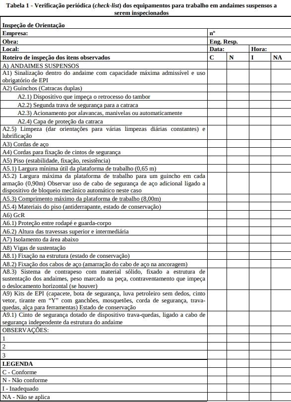 Para garantir a segurança, verificações de prevenção devem ser padronizadas, formalizadas e realizadas nas diferentes fases de produção da obra e nas atividades de manutenção pós-ocupação. Segue abaixo tabela sugerida para inspeções em andaimes suspensos, a serem elaboradas para todos os equipamentos e atividades de risco, durante a fase de produção. Deve-se propor tabela similar para a fase de manutenção da edificação. Essas verificações também auxiliam na avaliação dos projetos e devem realimentá-los a fim de diagnosticar soluções adequadas para empreendimentos futuros.