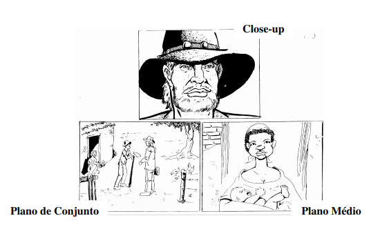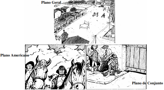 PLANO DE CONJUNTO:Plano filmado a uma considerável distância do assunto. Por exemplo: o plano geral de uma sala e seus ocupantes, que aparecem de corpo inteiro.