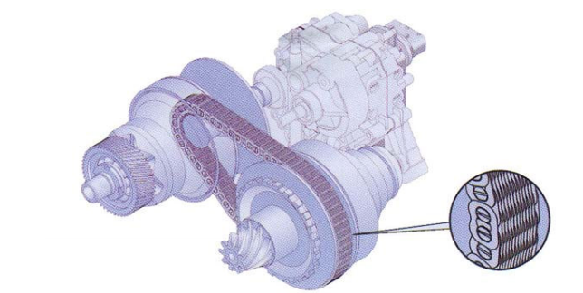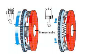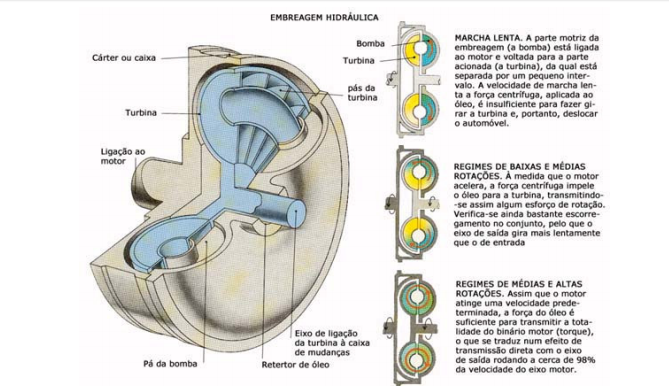 transmitido automaticamente a uma embreagem centrífuga que, por sua vez, faz mover dois tambores por meio de uma caixa redutora de engrenagens cônicas. Os diâmetros dos tambores variam de acordo com as velocidades de rotação destes, por meio de massas centrífugas e, de acordo com a posição do acelerador, por meio de uma câmara de vácuo. Duas correias trapezoidais dentadas rodam entre dois tambores pressionados um de encontro ao outro por meio de molas. Com aceleração baixas, o sistema proporciona automaticamente uma redução elevada.
